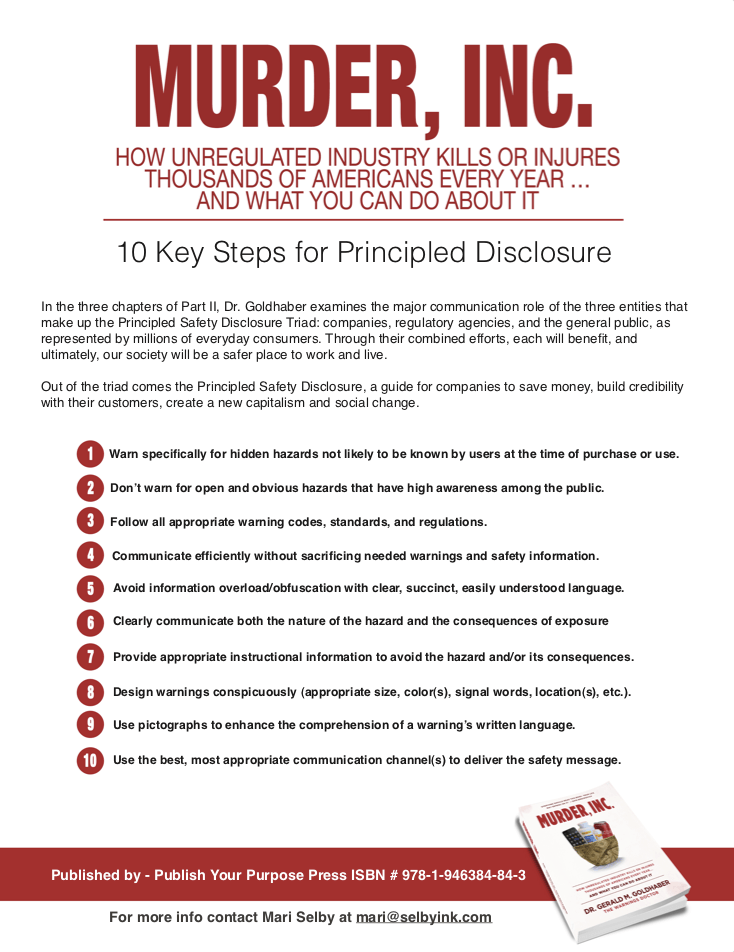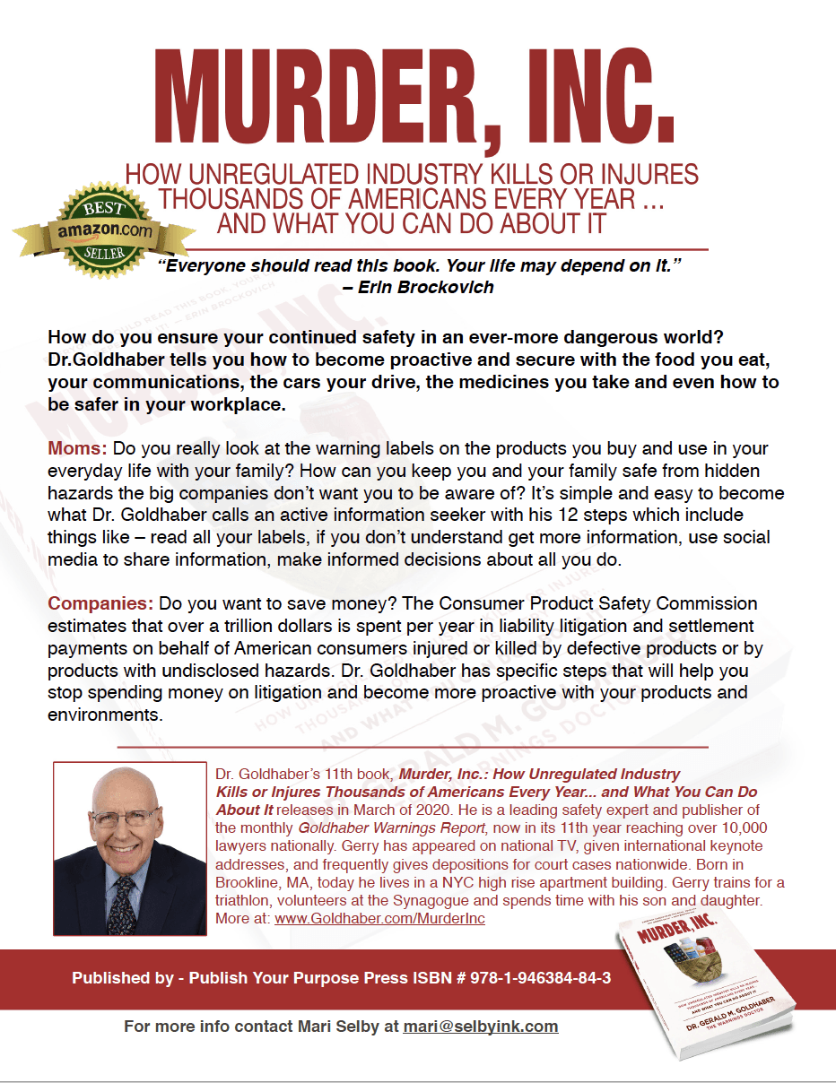 Dr. Goldhaber's 11th book, Murder, Inc. How Unregulated Industry Kills or Injures Thousands of Americans Every Year – and What You Can Do About It releases in March of 2020. “I tell the public about the hazards they face in virtually every aspect of their lives. I provide a roadmap for manufacturers, and regulators to engage in to reduce the likelihood of consumers suffering from serious or deadly consequences. The goals are for corporations to engage in ‘Principled Disclosure’, regulatory agencies to close the revolving door, and consumers to actively seek product safety information so they can make informed choices.”